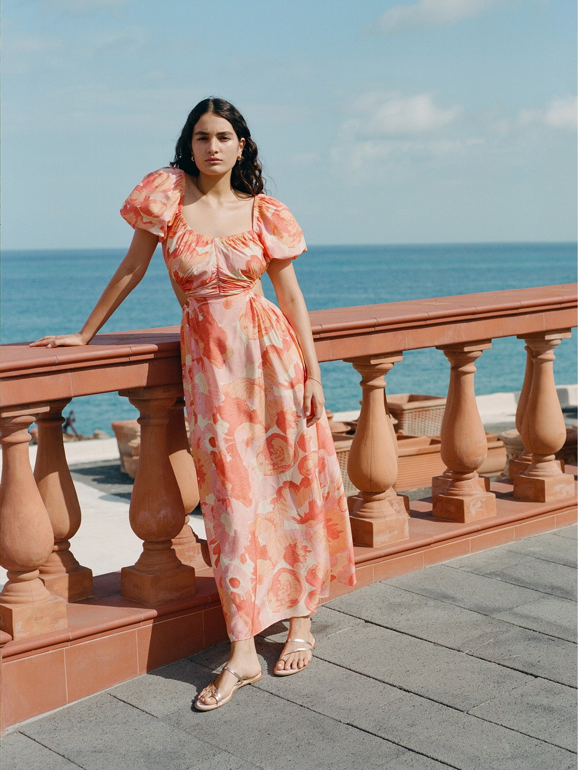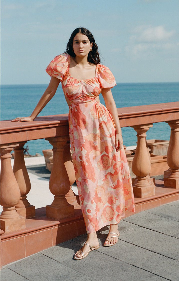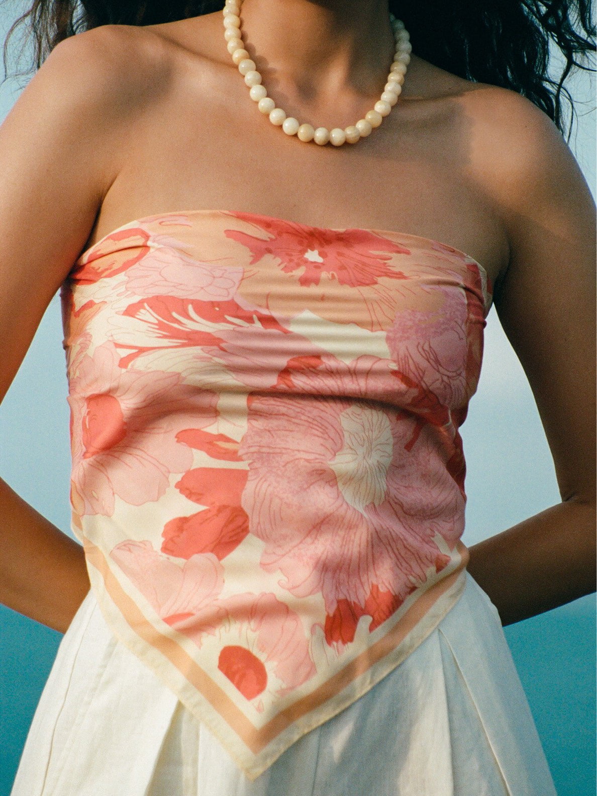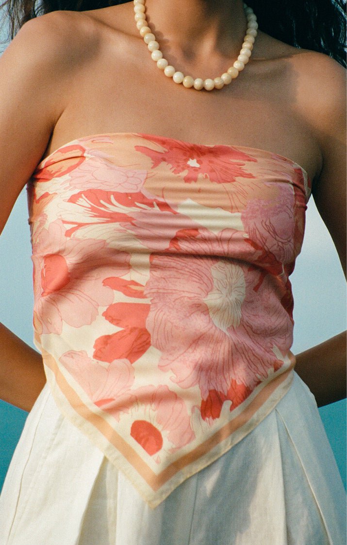 A sunset colour palette of sherbet pink, dusty rose and soft cream come to life in our exclusive hand-drawn floral.