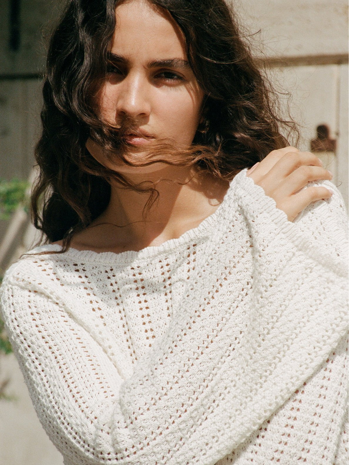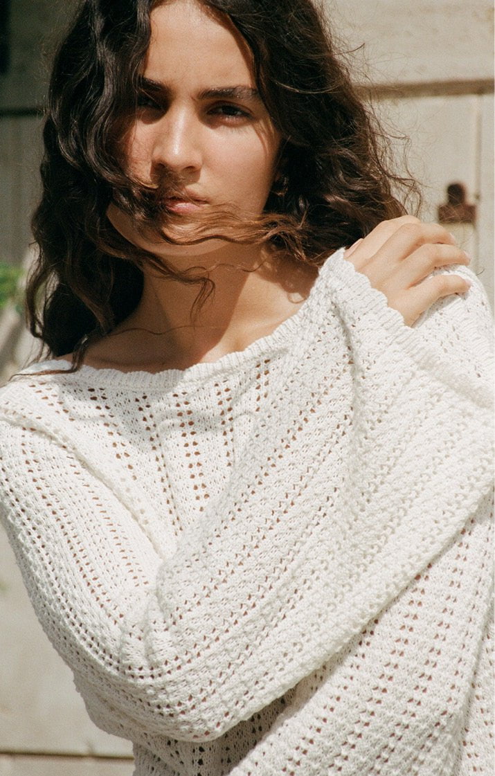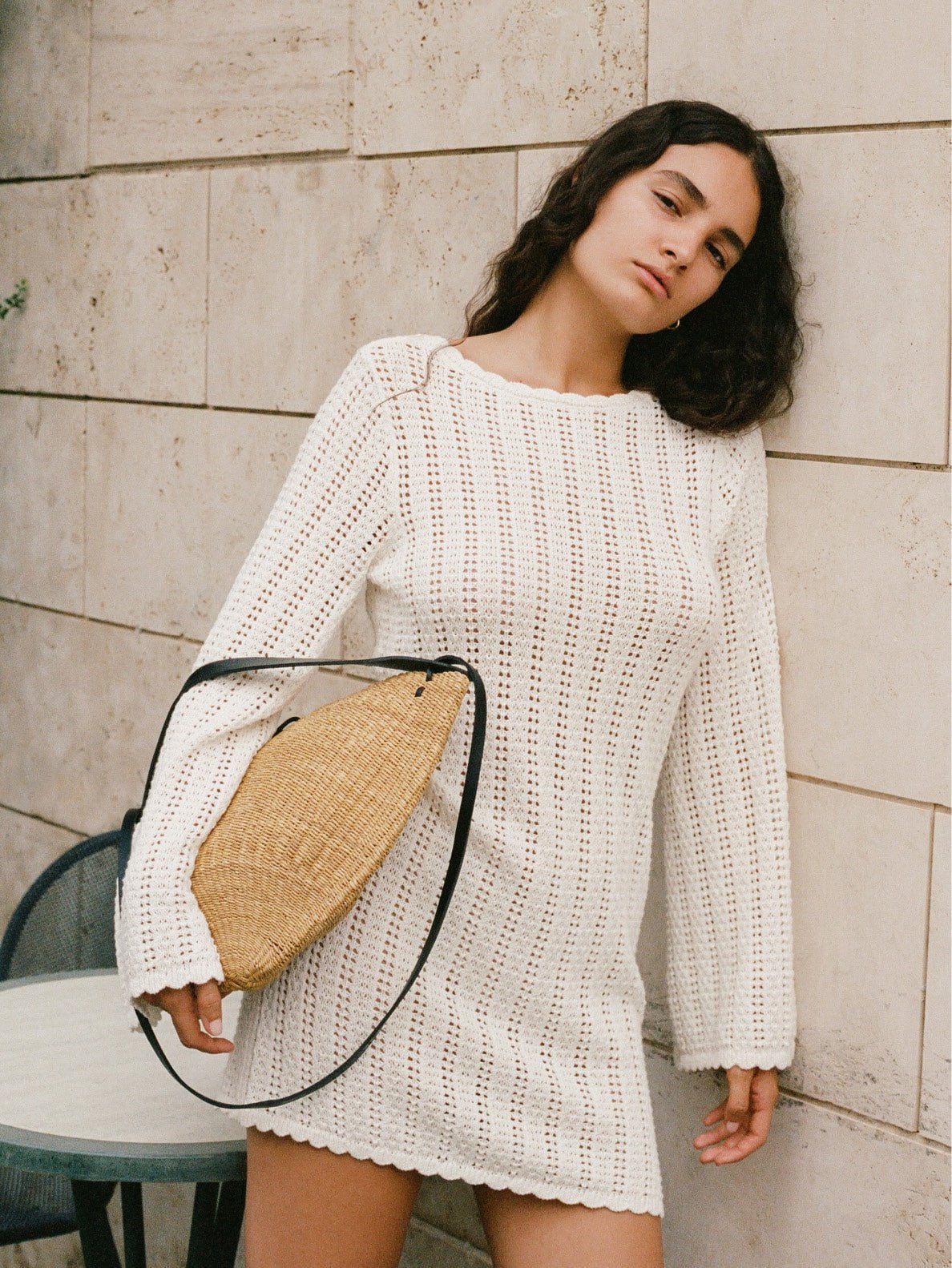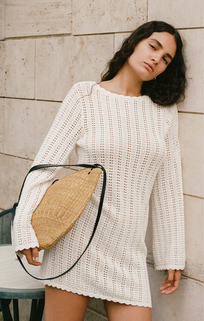 Blue florals are punctuated by fresh cream crochet and linen for effortless vacation wardrobing.