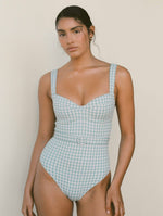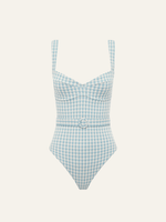 Our mostloved one piece design returns in the softest shade of blue. Made for sun—filled days by the water, this supportive silhouette is complete with adjustable straps, multi—option back closure and vintage inspired belt to cinch your waist.