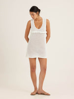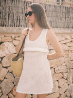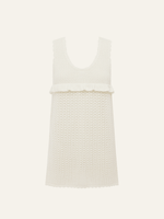 Meet the Pointelle Amelia Mini Dress — feminine with a touch of vintage charm. Crafted from our signature Pointelle knitwear, this sleeveless mini features a soft scoop neckline and a delicate knitted frill beneath the bust, bringing subtle movement and a playful, feminine detail to a classic shift.