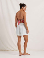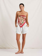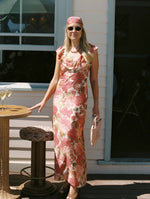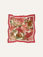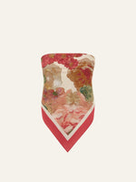The perfect summer accessory. Our handpainted Dahlia floral adorns the Signature Scarf, a versatile piece that elevates any look. Whether styled as a headscarf, tied to your favorite basket bag, or folded into a bandeau top, this scarf offers endless styling possibilities. Crafted from a sustainable blend of ECOVERO™ and silk, it is finished with a rubyred border and the peony brand logo. A timeless gift, perfect for any occasion, it's sure to be cherished for years to come.